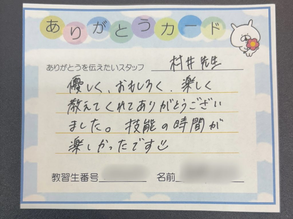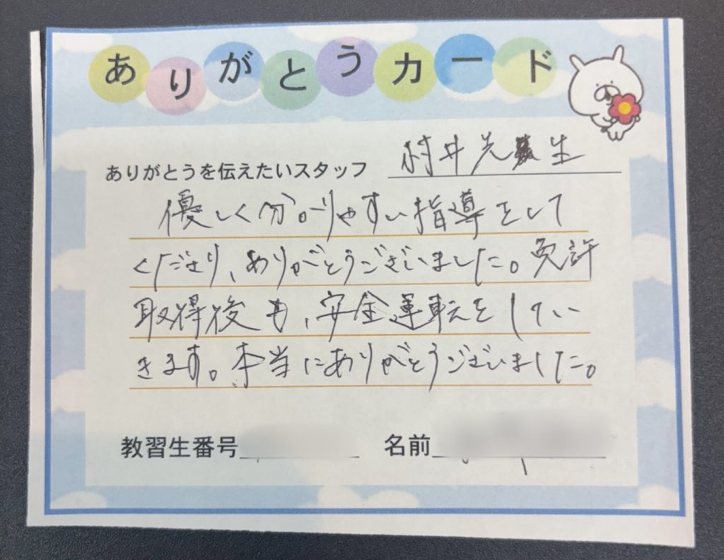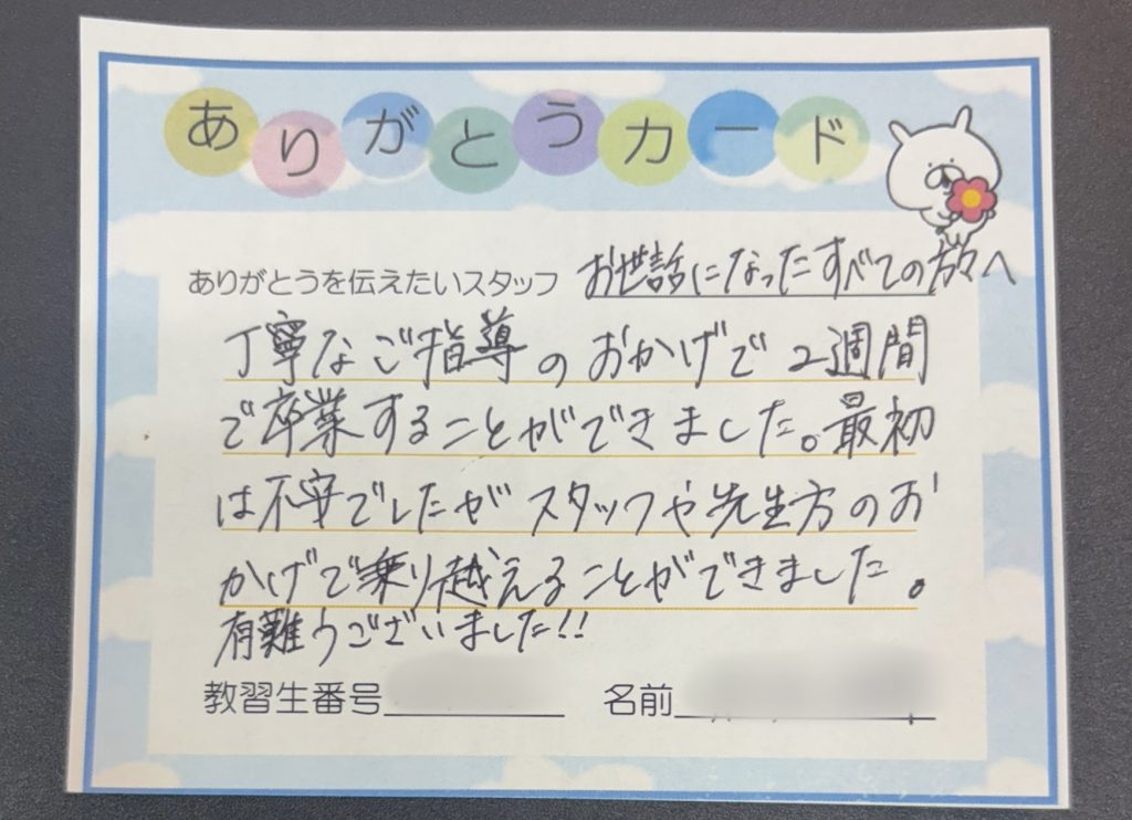 教習生の皆様より頂く「ありがとうカード」に、スタッフ一同より感謝申し上げます。