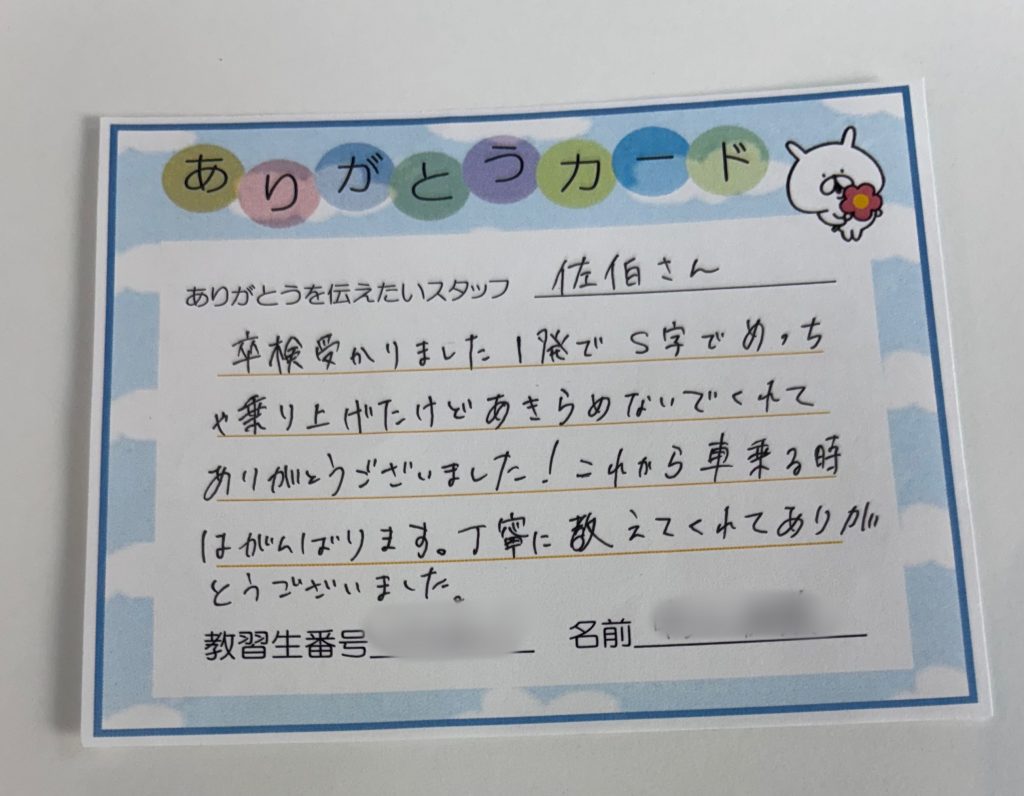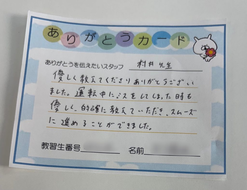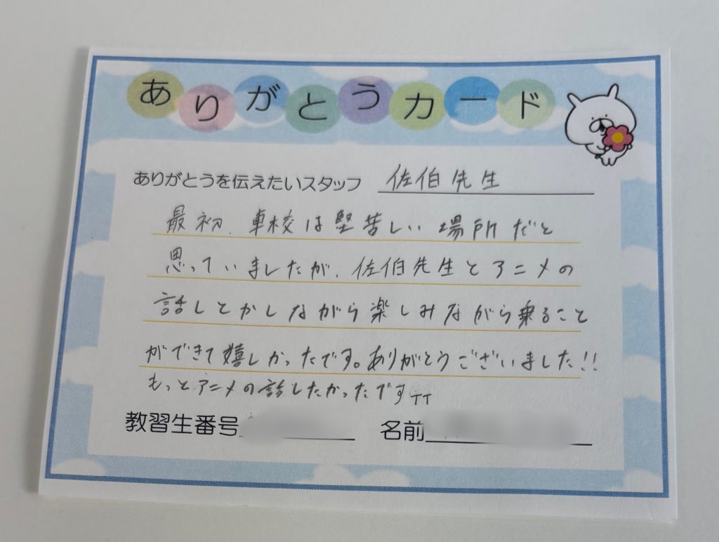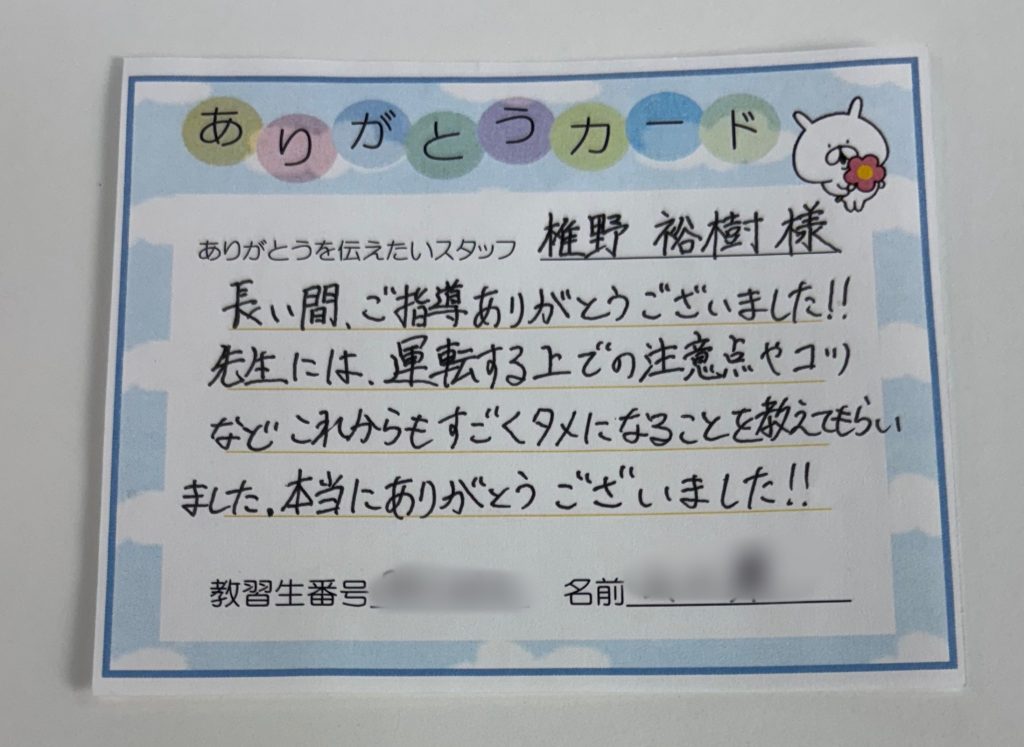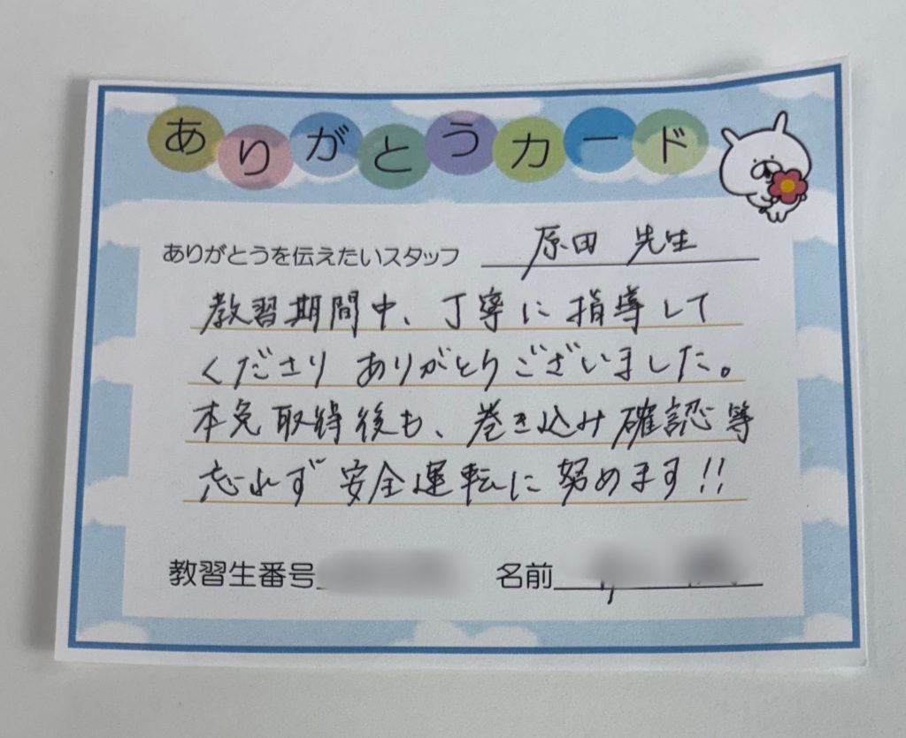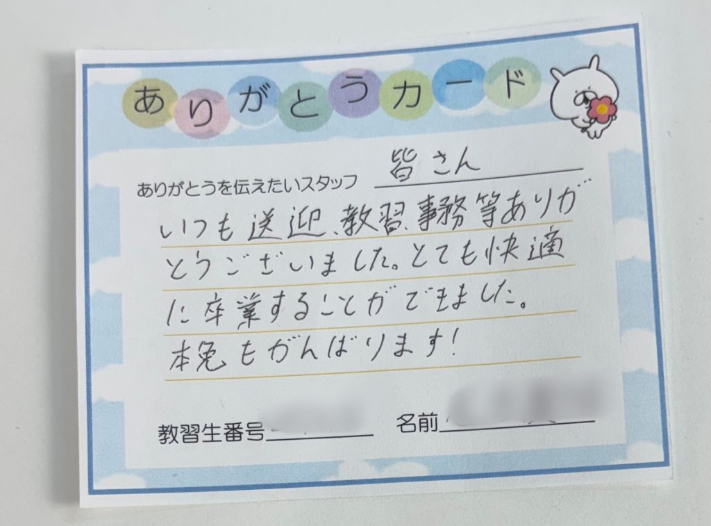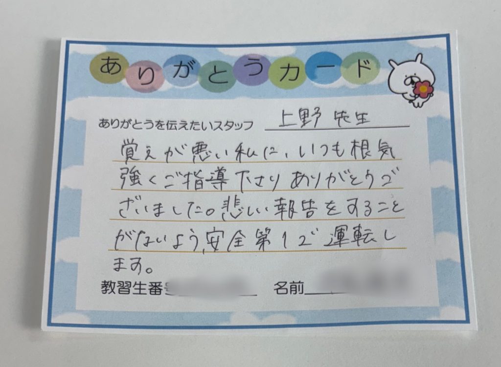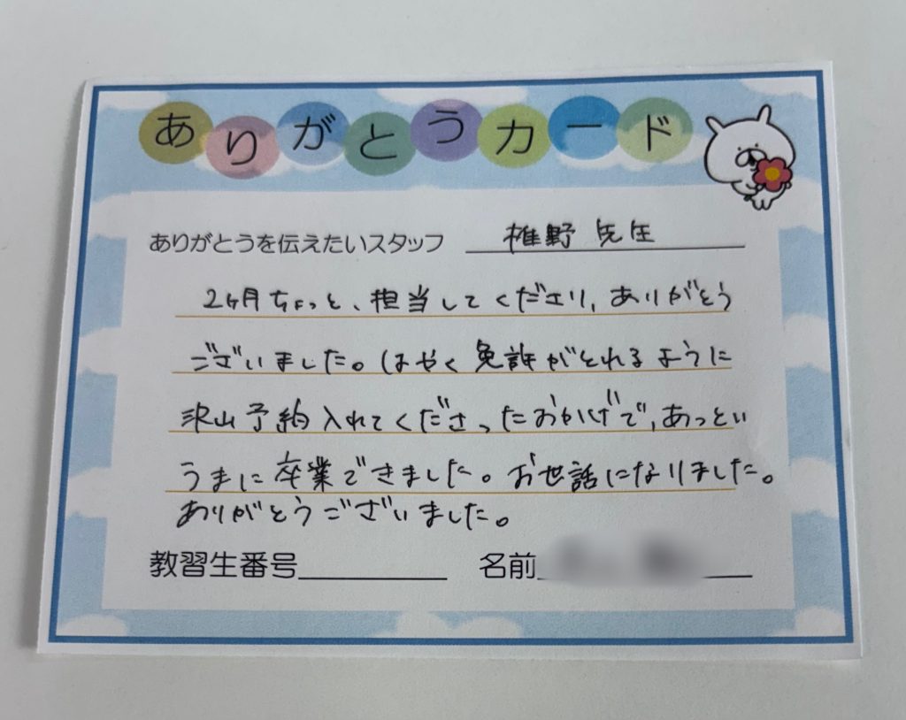 教習生の皆さまより頂く「ありがとうカード」に、スタッフ一同より感謝申し上げます。