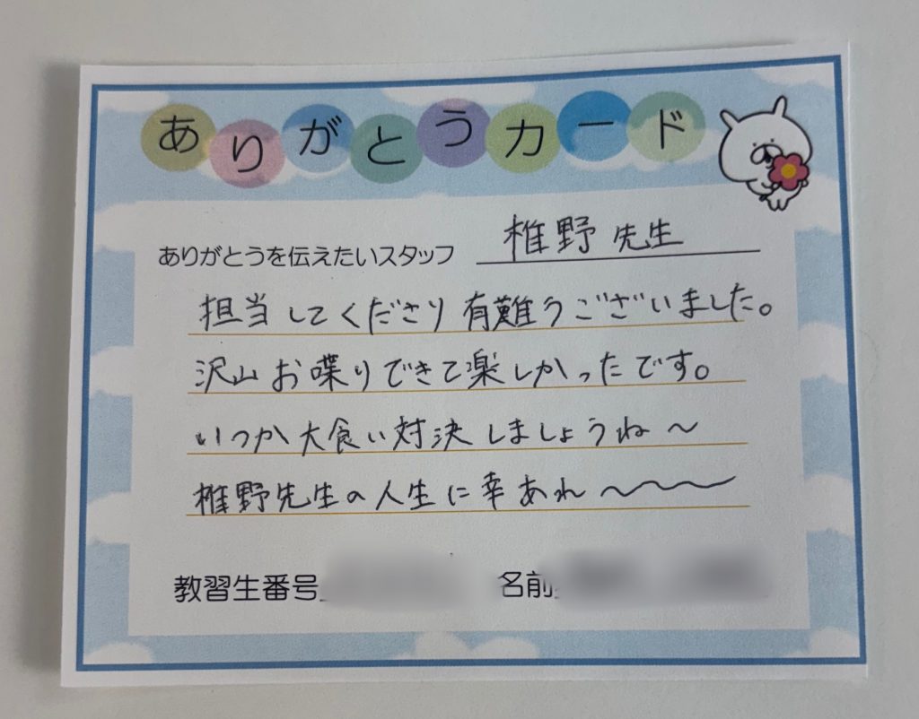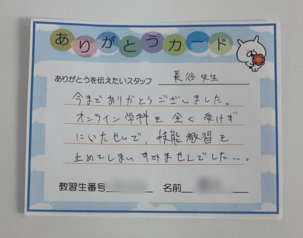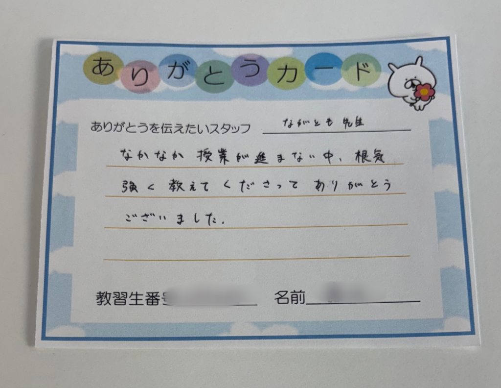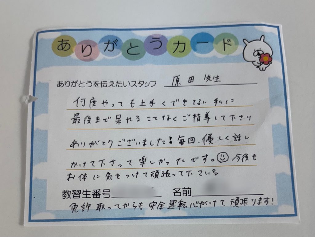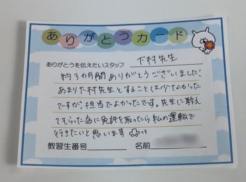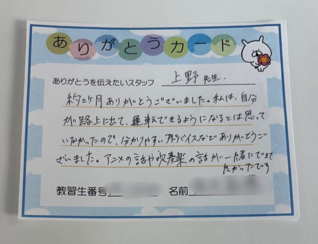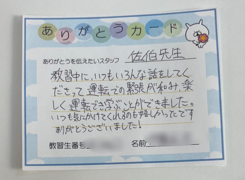 教習生の皆さまより頂く「ありがとうカード」に、スタッフ一同より感謝申し上げます。