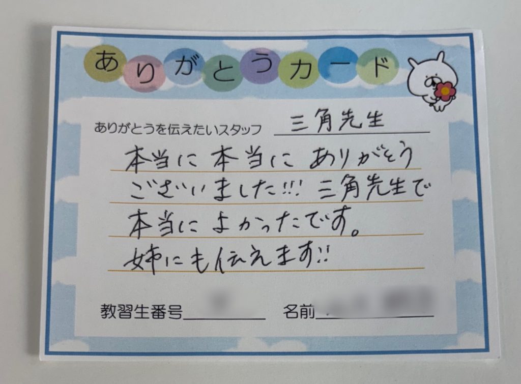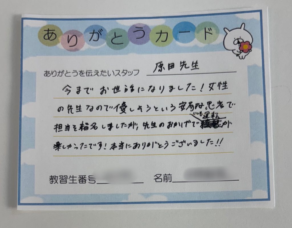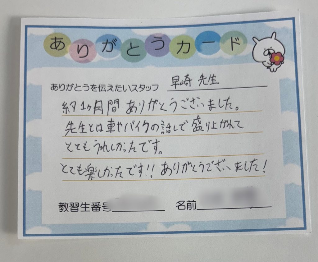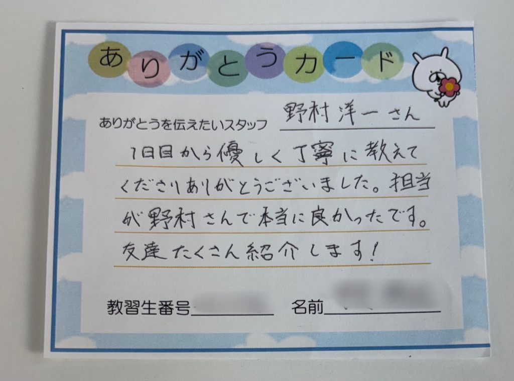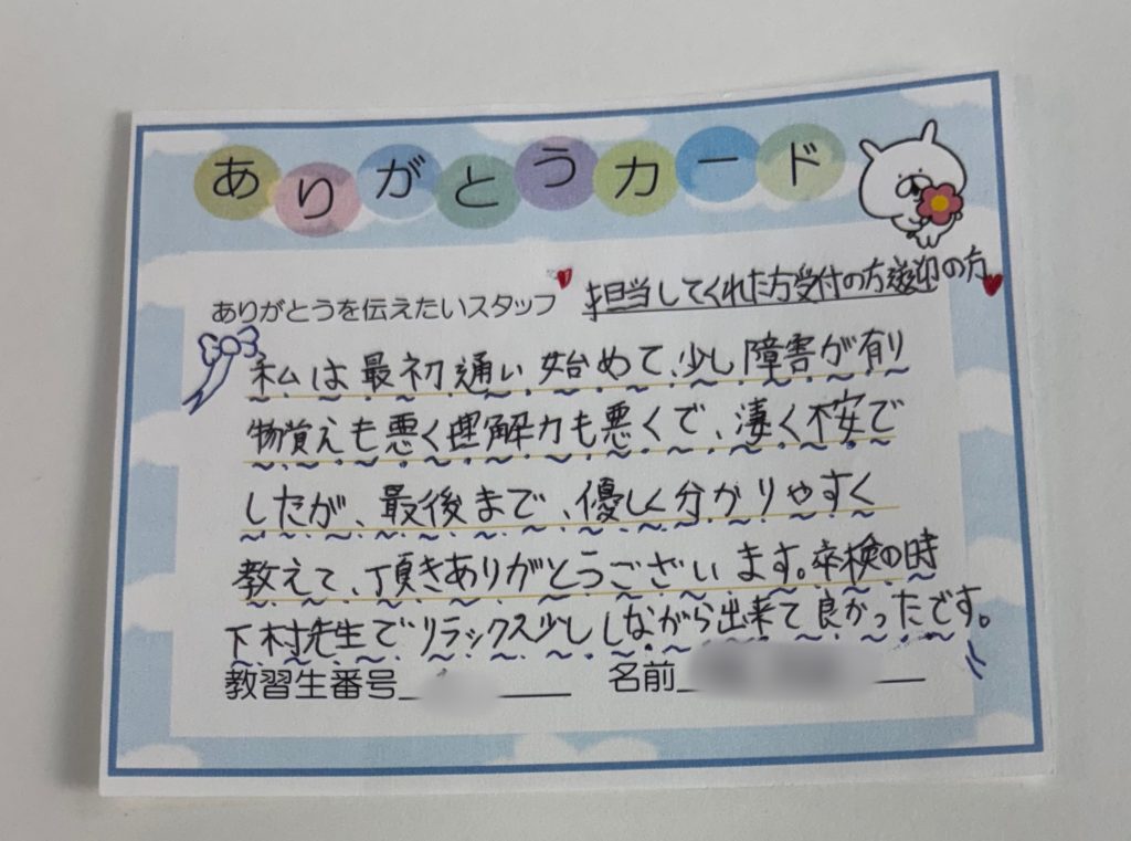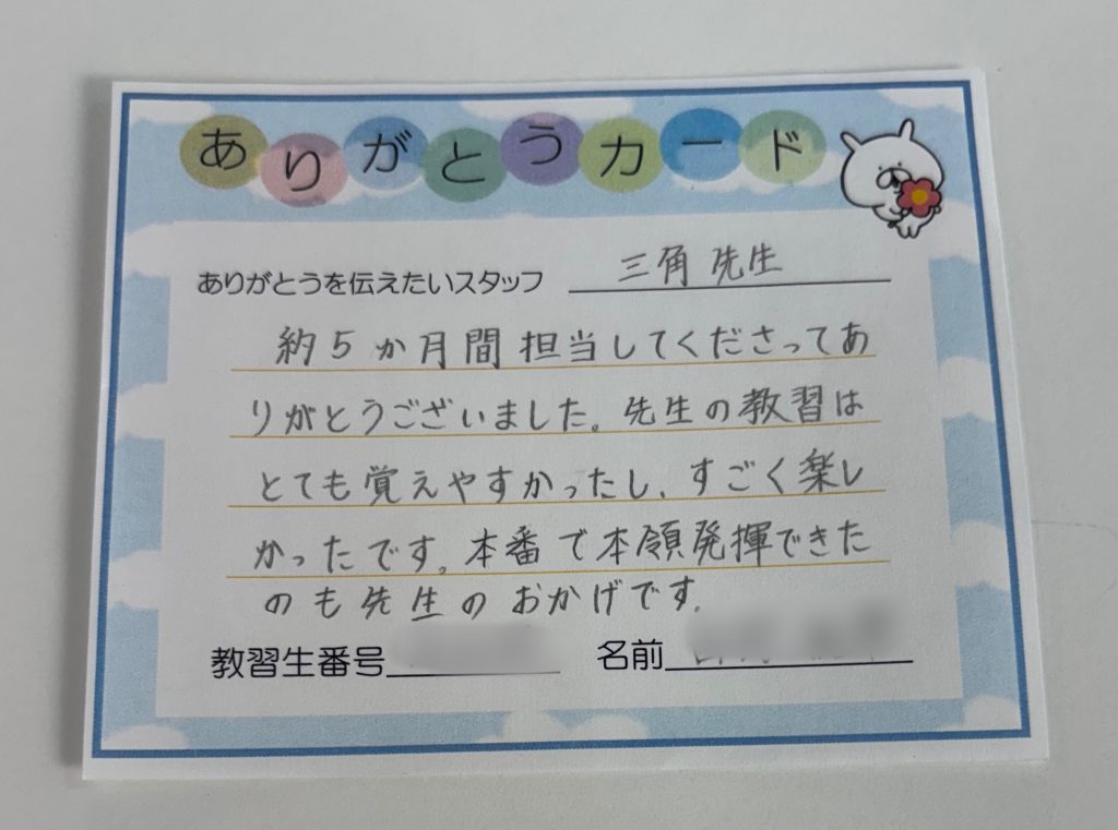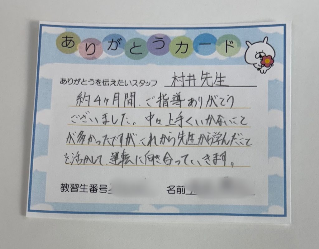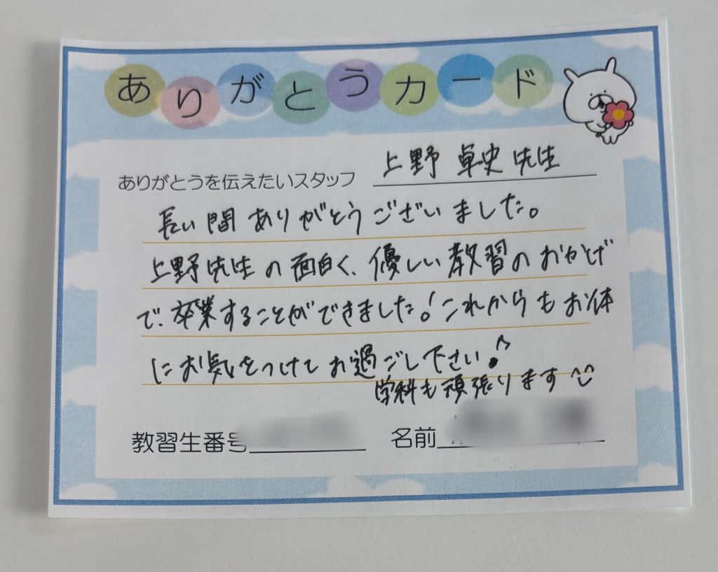 教習生の皆さまより頂く「ありがとうカード」に、スタッフ一同より感謝申し上げます。