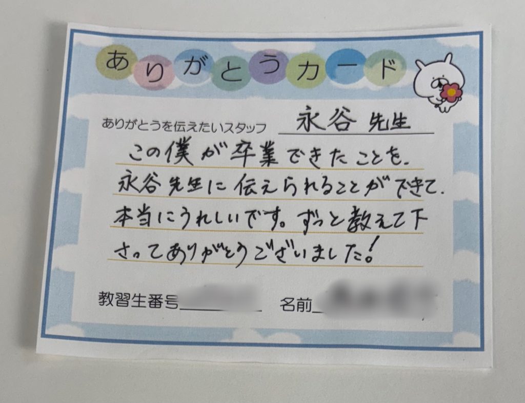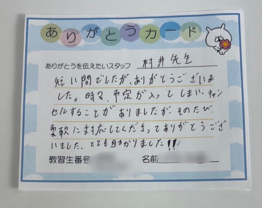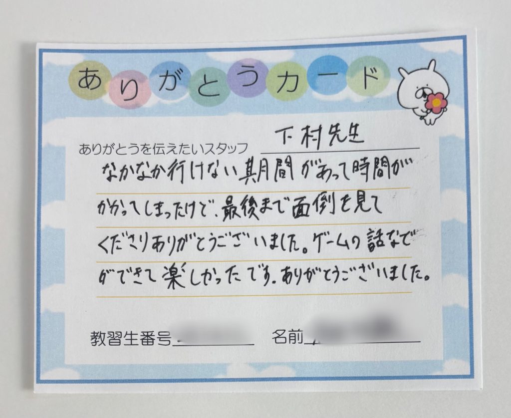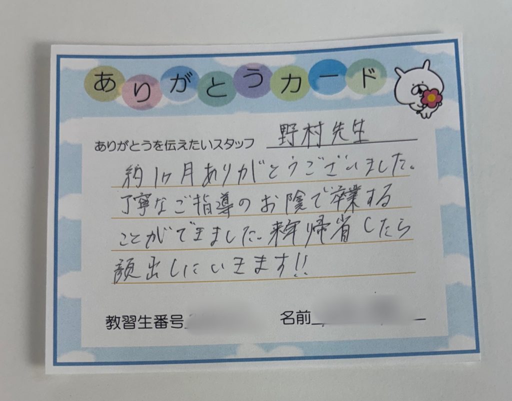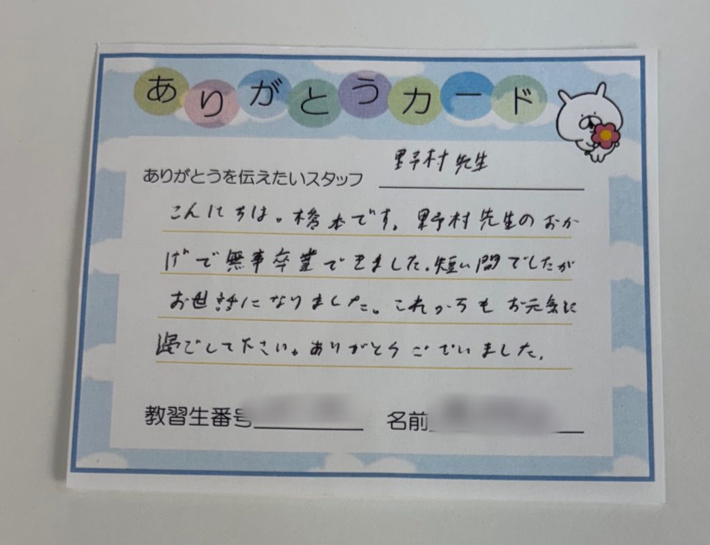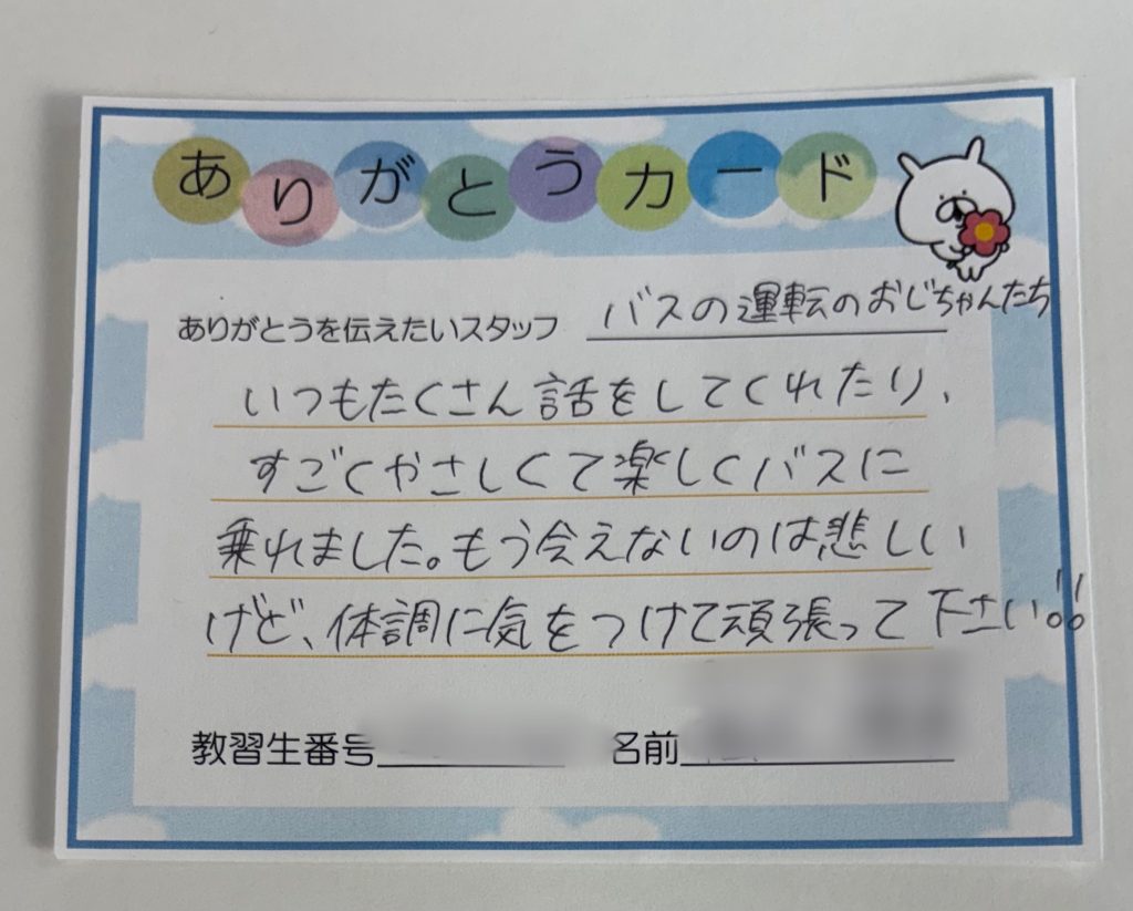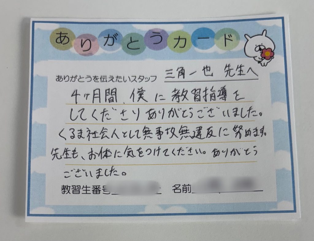 教習生の皆さまより頂く「ありがとうカード」に、スタッフ一同より感謝申し上げます。